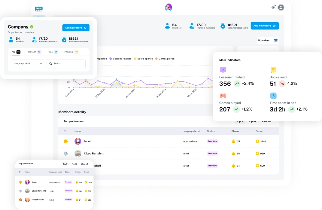 Real-time dashboards let teachers and school directors monitor engagement, skill growth, and language levels — with reports ready for parent meetings.