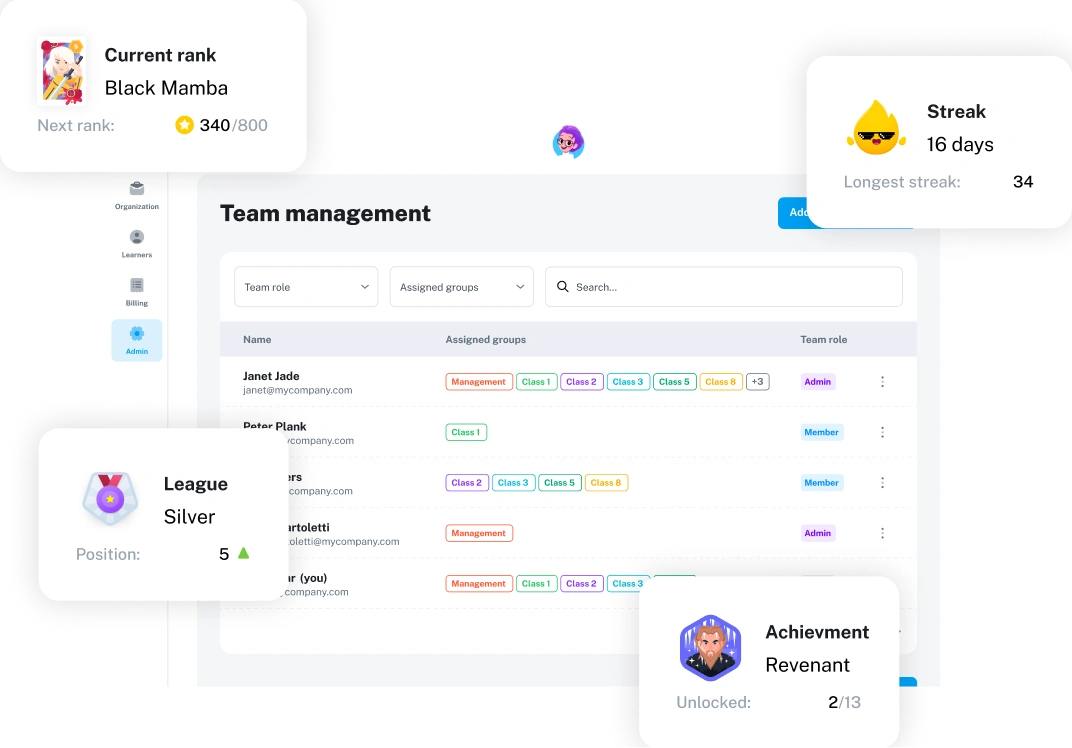 Leagues, streaks, achievements, and rewards. Gamification that keeps students practicing daily — learning feels like play, not homework.