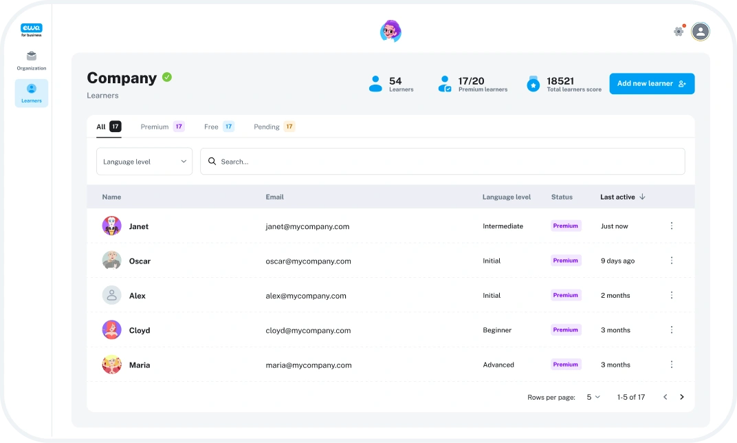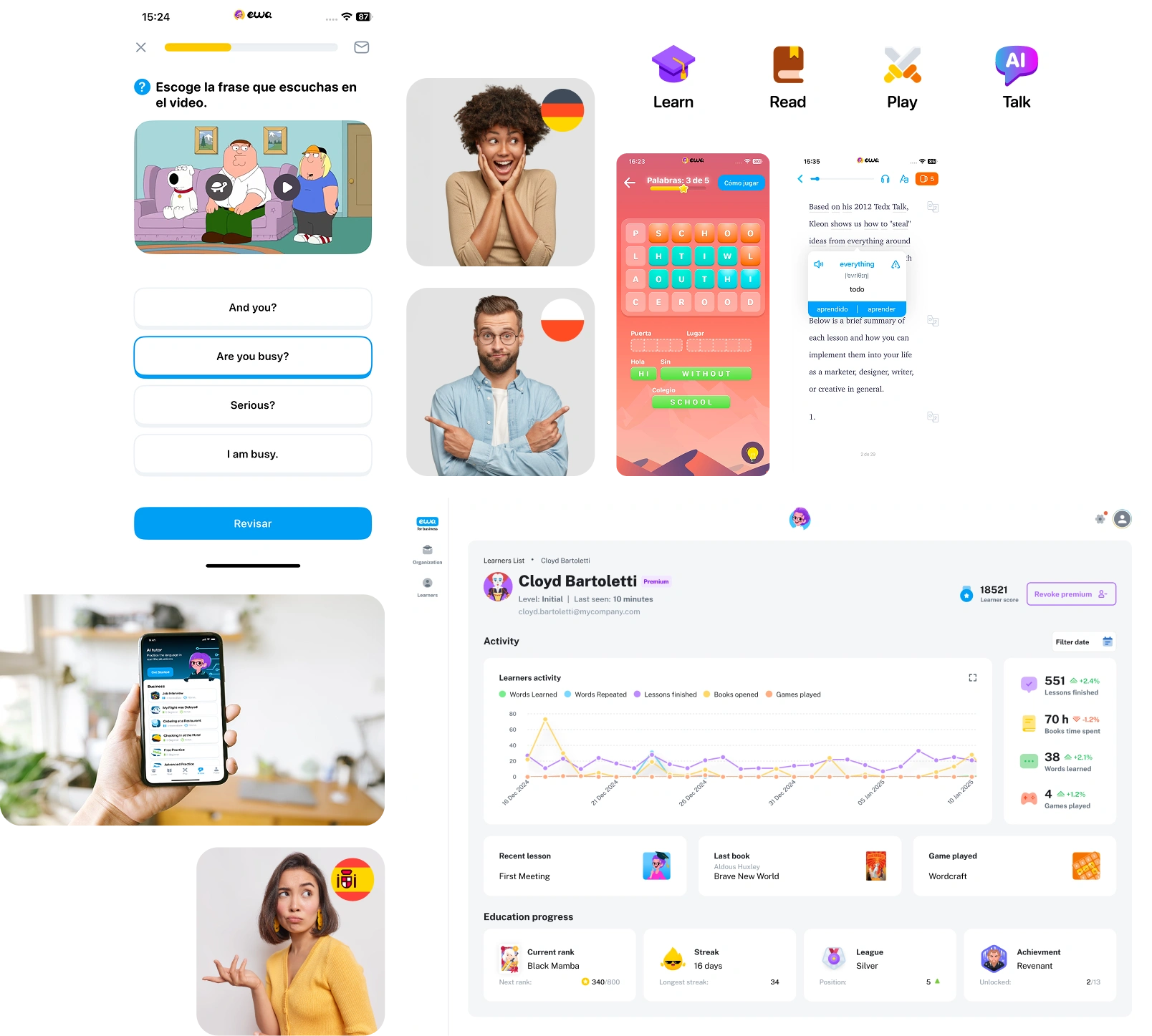 EWA combines adaptive learning, AI technology, and a real-time admin dashboard to help language schools and academies track student progress and boost engagement — with zero IT complexity.